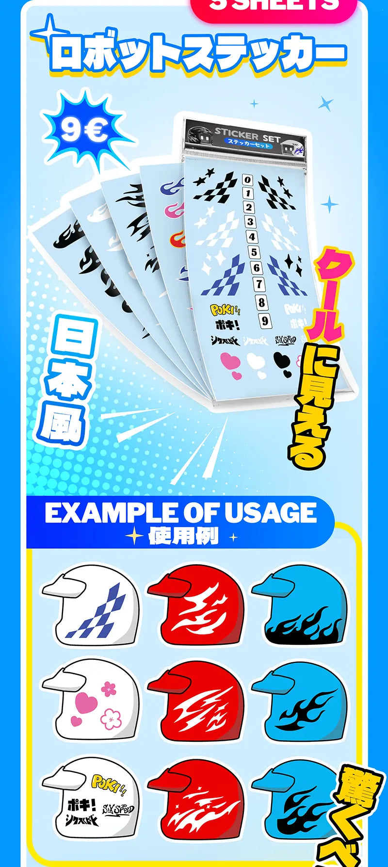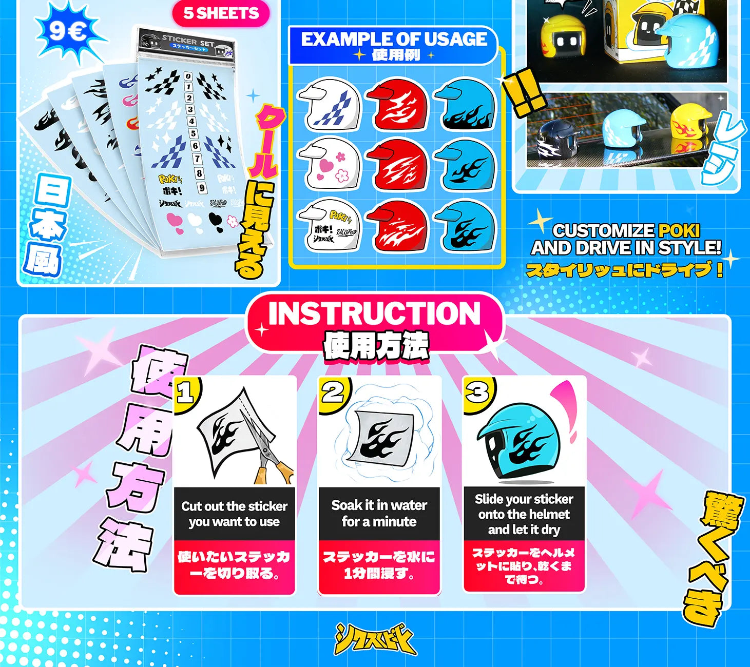 With this set of stickers you can make your Poki truly yours! 🤩 Do you want your little friend to match your vibe? 🔰 Just customize the helmet with the variety of decals and hit the touge with style! 😎