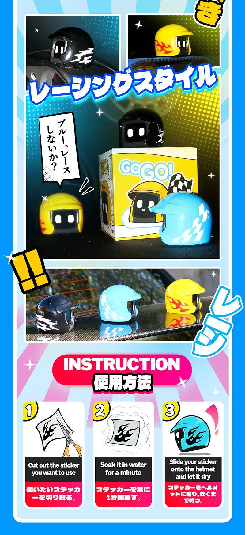*you just cut the sticker you want to use, soak it in water for a minute and slide it onto the helmet!